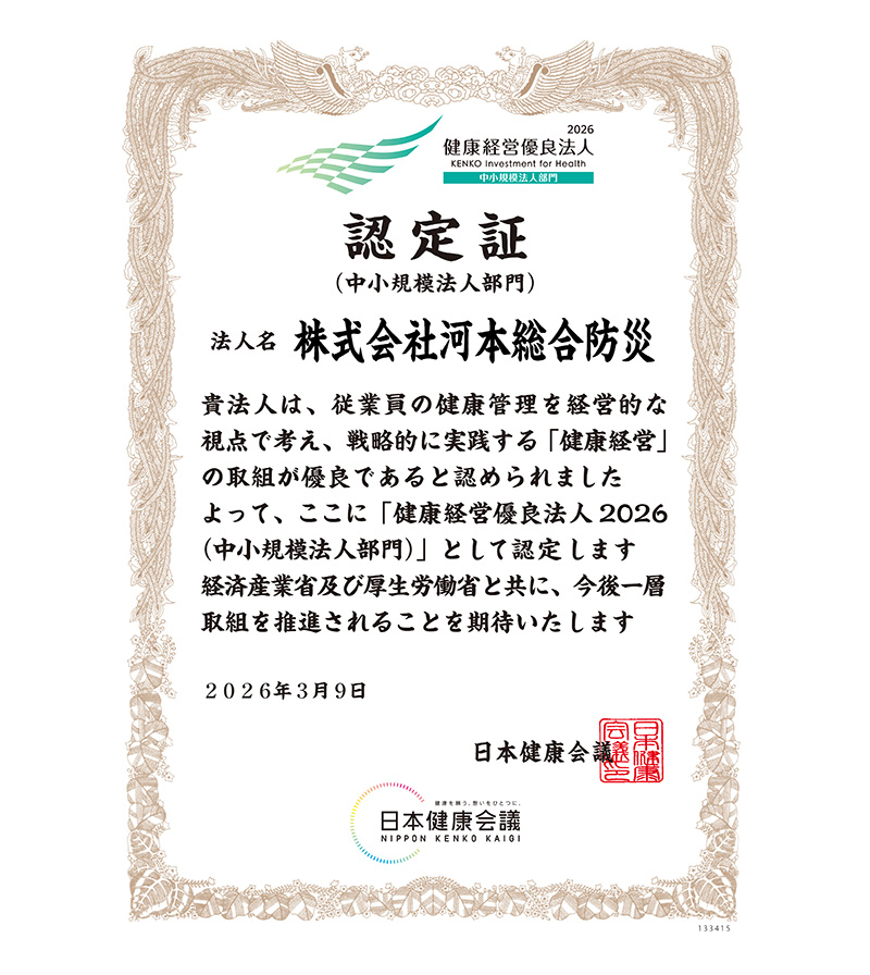 株式会社河本総合防災(代表取締役社長:山内 隆、以下「当社」)は、2026年3月9日付で、経済産業省および日本健康会議が共同で実施する「健康経営優良法人2026」に認定されましたことをお知らせいたします。